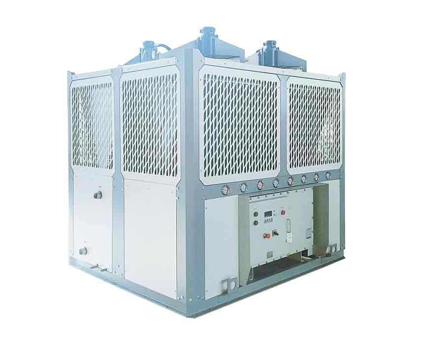 風冷式防爆型乙二醇低溫制冷機組通過風扇以空氣為冷凝方式的低溫控溫設(shè)備,單機輸出馬力從1HP~220HP;
